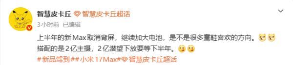 曝小米17 Max取消背屏选择加大电池 搭配2亿像素主摄