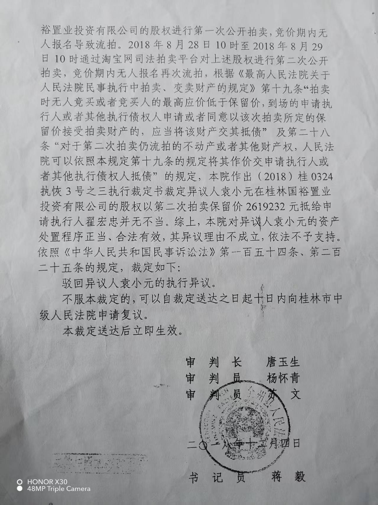更离奇的是,对于袁小元提出的执行异议,全州县法院副院长唐玉生先作出裁定,然后才举行听证会。