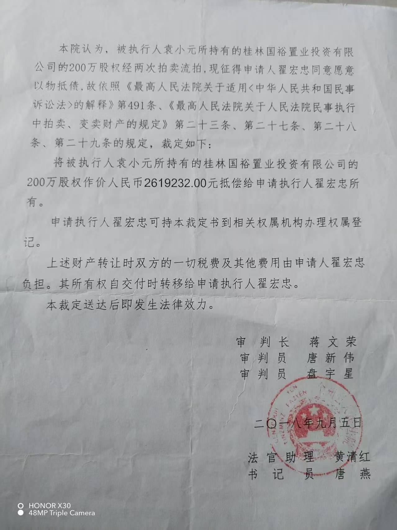 但奇怪的是,全州县法院在执行这一判决结果时,并未查封借款人蒋廷凤的资产,反而只查封袁小元所持有的桂林国裕置业投资公司的股份。