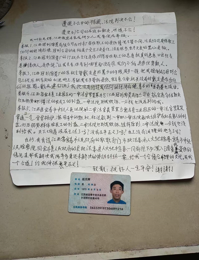 上述是赵永辉先生手写的举报信,字字泣血,令人悲痛。一场因工作纠纷引发的意外受伤,让他踏上了长达 700 多个日夜的维权之路。从工伤认定被拒、劳动仲裁驳回,到两审诉讼惨败,再到寄望检察机关再审监督,这个普通劳动者的公平诉求,在层层关卡中被无情碾压,暴露的不仅是个体的困境,更是劳动者维权路上的荆棘与黑暗。一、罚单起冲突,车间摔倒竟成 "自食其果"?2023 年 2 月,赵永辉怀揣着对安稳生活的憧憬,入职江西冠利陶瓷有限公司成为压机工。谁也没想到,这份看似稳定的工作,会因一张罚单彻底改写轨迹。2023 年 8 月 29 日,赵永辉因对车间主管戴友建开具的罚单提出异议,竟在工作群内遭到激烈言语围攻,随后被班长罗匡勇强行移出群聊。为讨要说法,赵永辉要求戴友建一同前往行政部理论,却在途中不慎绊倒在车间用于防水的沙袋上,导致左腕舟状骨骨折。江西冠利陶瓷有限公司对本厂受伤职工的伤情不管不问,也没有把受伤职工送到医院治疗,也没有给过受伤职工的任何的经济赔偿,冠利公司侵害了受伤职工的生命权,健康权,身体权没有得到保障,就医、鉴定、花费医疗费 3005.72 元、鉴定费 1100 元,各项损失合计33905.72元,这对于靠体力谋生的赵永辉而言,无疑是沉重打击。他坚信,自己在工作时间、因工作纠纷受伤,理应属于工伤,可这份合理诉求,却成了此后两年多维权路上的 "奢望"。二、四次维权全败:证据不足成挡箭牌,判决不公寒透人心2023 年 10 月,赵永辉提交工伤认定申请,却收到《不予认定工伤决定书》。认定部门无视其受伤与工作纠纷的直接关联,生硬套用《工伤保险条例》,以 "非履行工作职责" 为由驳回申请。随后的劳动仲裁、公安机关调查,均以 "证据不足" 告终,涉事主管戴友建甚至未受到任何行政处罚。被逼无奈的赵永辉提起民事诉讼,将戴友建与冠利陶瓷有限公司告上法庭,可法院的判决更让他心寒。一审法院仅凭 "目击证人证言" 和公安机关询问笔录,便认定赵永辉系 "自行绊倒",全然不顾证人与企业存在的雇佣关系,其证言客观性本就存疑;对于冠利陶瓷有限公司车间沙袋未设警示标识、存在安全隐患的问题视而不见,反而认定公司 "合理管理行为",判决赵永辉承担 "举证不能" 的后果,驳回全部诉求。二审法院更是草草维持原判,500 元案件受理费还要由身心俱疲的赵永辉自行承担。所谓的 "证据不足",不过是冠冕堂皇的借口,赵永辉认为法院和企业存在官商勾结、官官相互,两级法院判决不公令赵永辉失望。事发车间存在监控盲区,这是企业管理的疏漏,却让劳动者为举证难买单;与企业存在依附关系的证人证言被采信,而赵永辉手中的群聊记录、病历本、司法鉴定报告等材料,却被法院选择性忽视。这样的判决,何来公平可言?不过是让弱势劳动者 "有理说不清",让不公披上了法律的外衣。三、企业嚣张跋扈:"尽管去告" 的底气,是对劳动者的公然碾压比起维权路上的四处碰壁,冠利陶瓷有限公司的傲慢与嚣张更让赵永辉绝望。受伤后,赵永辉多次找到公司行政办肖伟协商赔偿,甚至作出 "赔偿合理便不起诉" 的让步,可肖伟却态度嚣张,直言 "尽管去告,告到哪都没用"。找到公司总经理时,对方更是推诿塞责,声称 "赔偿找伤人者,与公司无关",全然无视赵永辉在工作时间、工作场所受伤的基本事实。作为用人单位,冠利陶瓷有限公司不仅未建立公正的内部纠纷处理机制,用简单粗暴的 "踢群" 方式激化矛盾,更在安全管理上存在明显漏洞,车间防水沙袋未设警示标识,直接威胁员工通行安全。事故发生后,不仅不主动承担责任,反而以强硬态度逼迫劳动者走上诉讼之路,其行为本质上是对劳动者权益的公然践踏,是资本对弱势劳动者的赤裸裸压迫。四、维权难如登天:劳动者的公平诉求,为何成了奢望?赵永辉的遭遇,并非个例,而是无数劳动者维权困境的缩影。"没钱、没人、没证据",这三座大山压得劳动者在维权路上举步维艰。企业掌握着管理主动权、监控资源、证人关系等优势,而劳动者往往信息不对称、资源有限,一旦发生纠纷,举证难、成本高、程序复杂等问题接踵而至。法院本应是公平正义的最后一道防线,可在赵永辉的案件中,判决却背离了实质正义,让 "证据不足" 成为企业脱责、劳动者败诉的万能理由。这种 "赢了法律,输了公平" 的结果,不仅寒了赵永辉的心,更让无数劳动者对维权失去信心 —— 当遵循合法途径却换不来公正对待,当有理有据却被层层推诿,公平正义又在哪里?如今,赵永辉仍在等待检察机关的再审监督回复,希望有关部门能够重视并关注他的案件,能够得到应有的赔偿,解决这么多年未解决的劳动纠纷,这份期待能否打破僵局,仍是未知数。700 多个日夜的奔波,耗尽了他的时间、精力和积蓄,让这个普通家庭陷入绝境。他只是想要一份应有的赔偿,想要一个公道,可这个简单的诉求,却在资本与权力的夹缝中难以实现。赵永辉的疑问振聋发聩:"如果连我这样坚持维权的人都得不到公正对待,那还有多少劳动者敢站出来维护自己的权益?" 此案撕开了劳动者权益保障的痛点:当企业可以肆意欺压员工,当法院判决背离公平正义,当维权之路变成血泪之路,所谓的 "有法可依、有处说理" 便成了空洞的口号。完善劳动者维权机制、降低维权成本、严惩企业侵权行为,让公平正义不再迟到,已是刻不容缓!