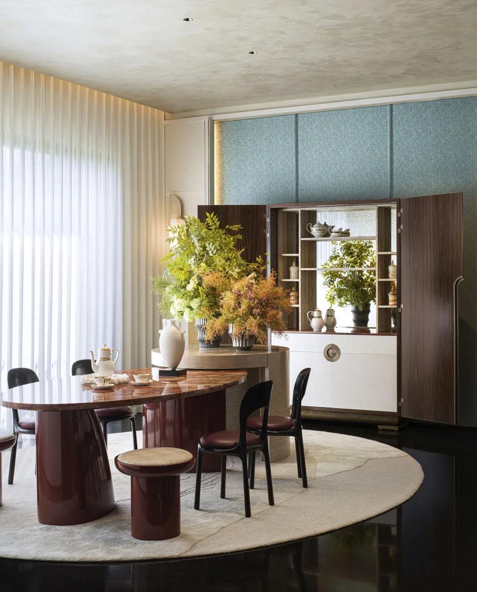 艺术沙龙区以现代雅集的形式可汇聚好友在此品茗赏景。 圆形餐桌与造型别致的座椅环抱成景,以流畅曲线勾勒出空间的艺术轮廓。绿植与花艺悄然点缀,陈列柜中的器物静默成诗,为场域注入自然生机与人文雅韵。墙面柔和的色调与精心布局的灯光交织,轻盈地化解了深色地面的沉稳,共同渲染出一片温暖而灵动的氛围。