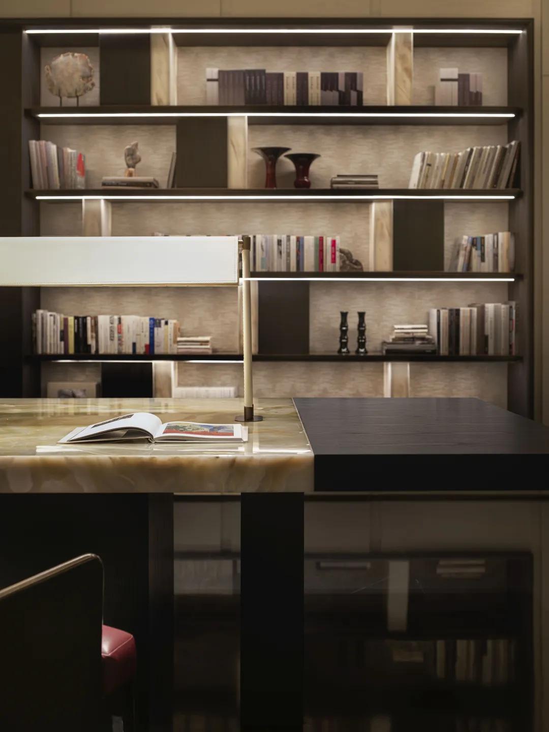 阅读区延续建筑廊亭的曲面天花造型,书架依墙而立,整齐的格序不仅容纳万千册卷,更在视觉上构建出深邃的秩序之美。墙面饰物与灯光默契相协,暖黄色的光晕如薄暮般漫溢,悄然软化深色的沉郁,为空间注入一抹温润与雅意。长桌静置中央,围合起专注阅读与思想交流的场域;临窗一隅,则设有一处休憩角落,供人独享与书为伴的宁静时光。