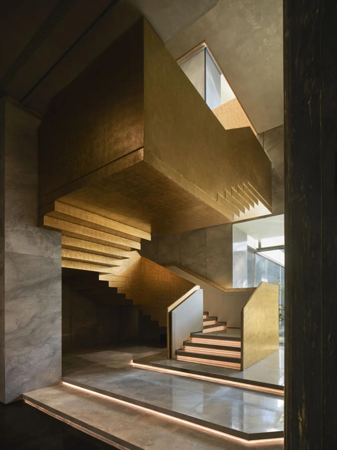 楼梯在空间中承上启下,形态上从如意祥云纹样中提取元素,寓意吉祥高升,展现了东方祥瑞文化的当代演绎。金属阶梯与沉稳石墙构筑出空间的冷峻基底,传递着富有力量感的工业美学。阶梯利落的几何形态与墙面简洁的线性语言彼此呼应,于结构中构建出严谨而强烈的秩序。