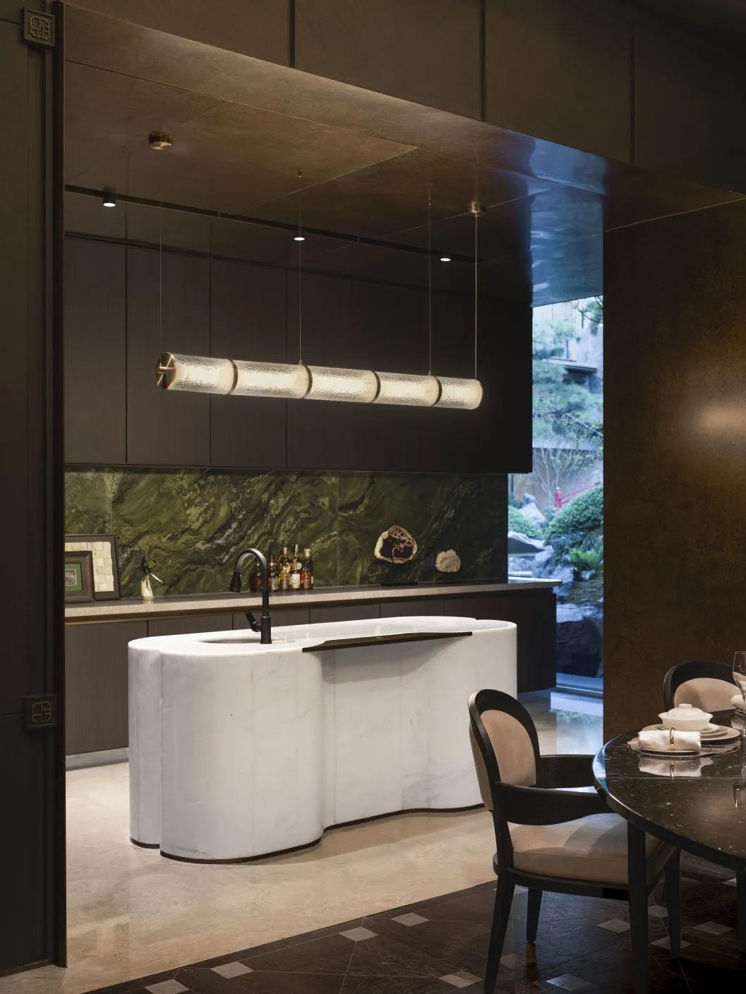 水吧区汲取传统宫灯形意,以六角造型吊顶勾勒视觉焦点,倾泻而下的暖黄光晕,瞬间唤起来自东方的温暖记忆。其下,深色大理石吧台以冷峻质感沉稳承接,与光影交织出冷暖相宜的对话,在致敬传统与满足功能之间,达成精妙的平衡。