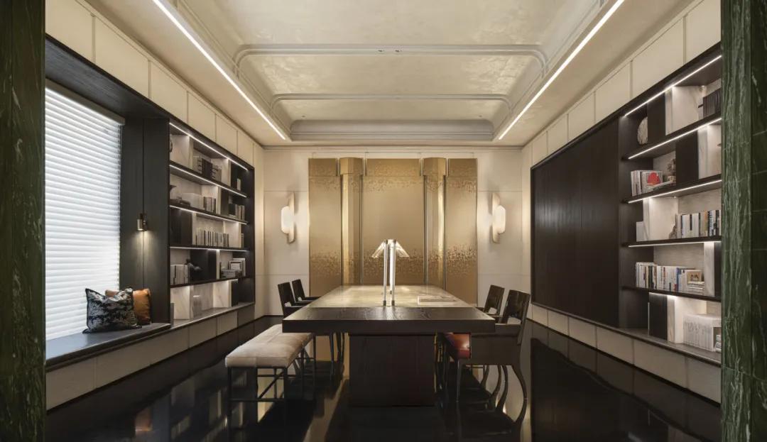 茶室设计简约而意境深远,既可观景,亦可品茗,将东方生活美学体现得淋漓尽致。以“禅意自然,古今交融”为精神内核,空间以深色调铺陈静谧氛围,传统制式的茶桌与座椅,沉淀着中式茶道的风骨与温度;而线条简练的现代灯具,则轻盈地勾勒出当代的审美意趣。一侧,整面落地窗将室外山水园林的四季变幻纳入视野,以“借景”之法,模糊了内与外的界限,让茶香与自然之趣在空间中交融共鸣。
