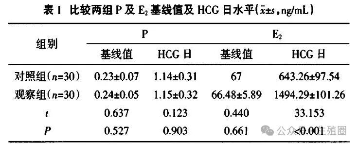 结果发现,两组患者孕酮和雌二醇基线水平及hcg人水平差异均无统计学意义,观察组hcg日雌二醇值显著高于对照组,且差异有统计学意义。