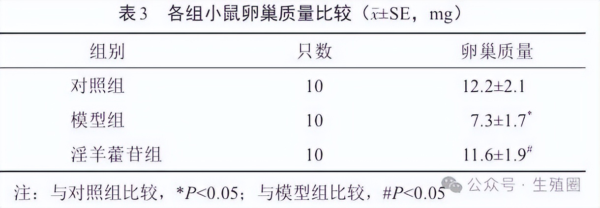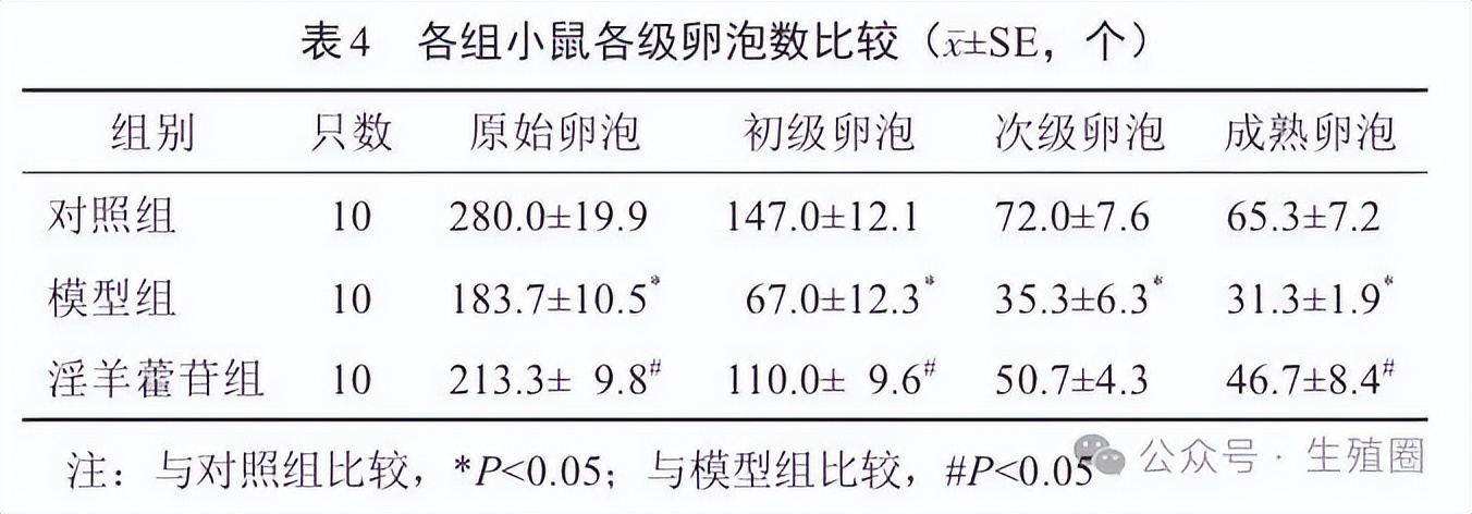 这表明淫羊藿通过降低模型小鼠血清FSH水平,提高E2水平,增加小鼠卵巢质量和卵泡数量,从而增强卵巢储备功能,对环磷酰胺所致的小鼠卵巢早衰有明显的治和缓解作用。