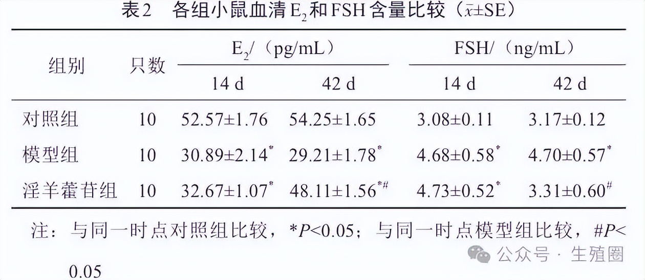 使用淫羊藿对模型卵巢早衰组小鼠的治疗发现,淫羊藿组小鼠血清E2含量显著增加,FSH含量显著减少。