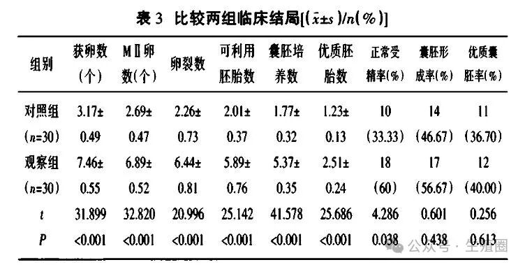 两组临床结局对比,与对照组相比,淫羊藿观察组获卵数、MII卵数、卵裂数、可利用胚胎数、囊胚培养数及优质胚胎数量均更多,正常受精率均更高,两组差异有统计学意义。