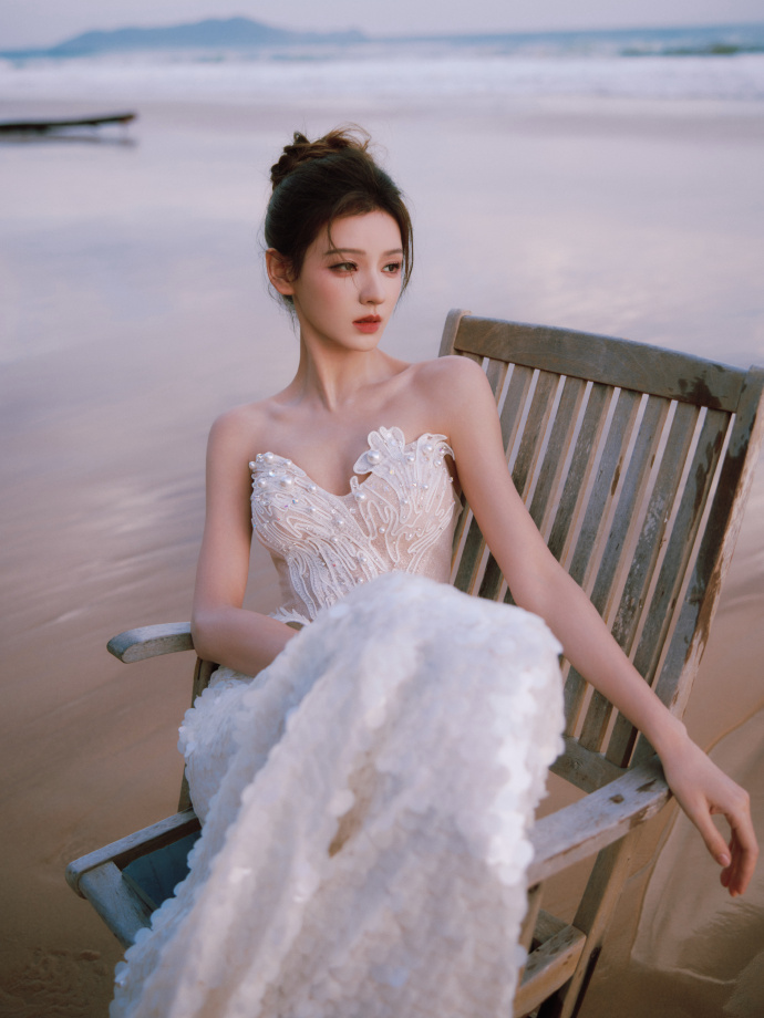 张予曦今日份白色抹胸裙写真,好漂亮的新娘子