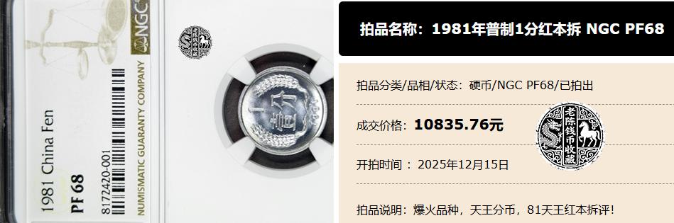 举例来说,一枚1981年的普制1分红本拆的NGCPF68分硬币,就是在12月15日以10835.76元的高价成交。