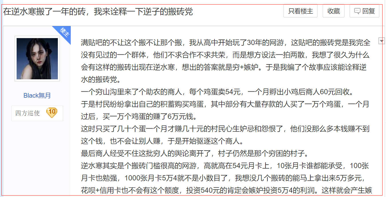 他的发声迅速引发黄金服玩家的广泛共鸣,不少人纷纷表示有过类似困扰。在庞大的玩家基数下,鱼龙混杂的市场环境让“搬砖”不再是单纯的游戏操作,更成了对心态与策略的双重考验。尽管竞争激烈,但多数从业者并未选择离场。毕竟在PC端游整体式微的当下,像《逆水寒》黄金服这样坚持纯正MMO特色,且能让玩家通过“搬砖”实现高收入的平台实属罕见。