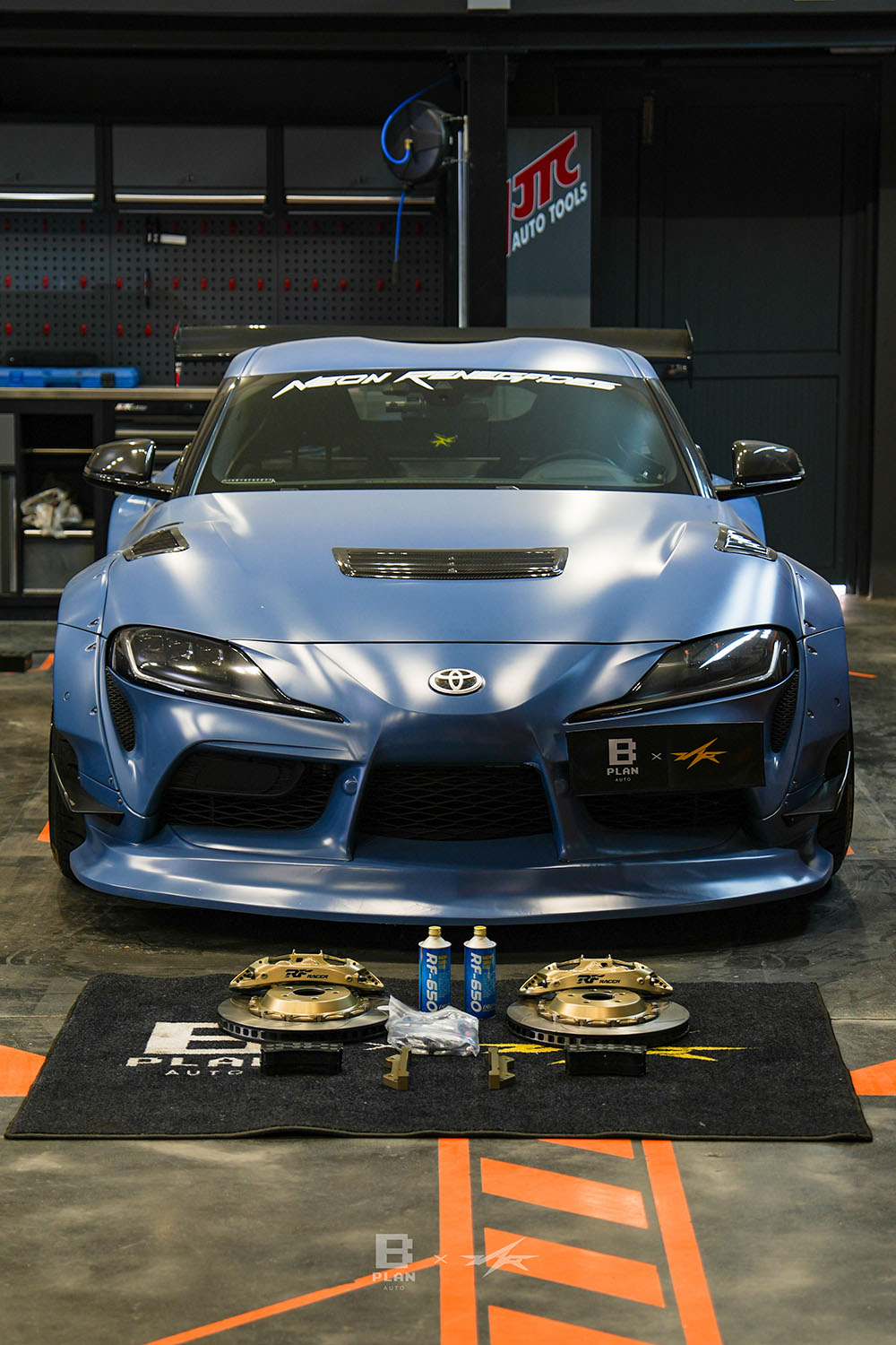 针对 Supra 的性能特性与改装诉求,专业的制动系统制造商 RF RACER 提供了完美的系统级解决方案:RF6901 高性能刹车套装,匹配 380mm 大尺寸划线碟盘。