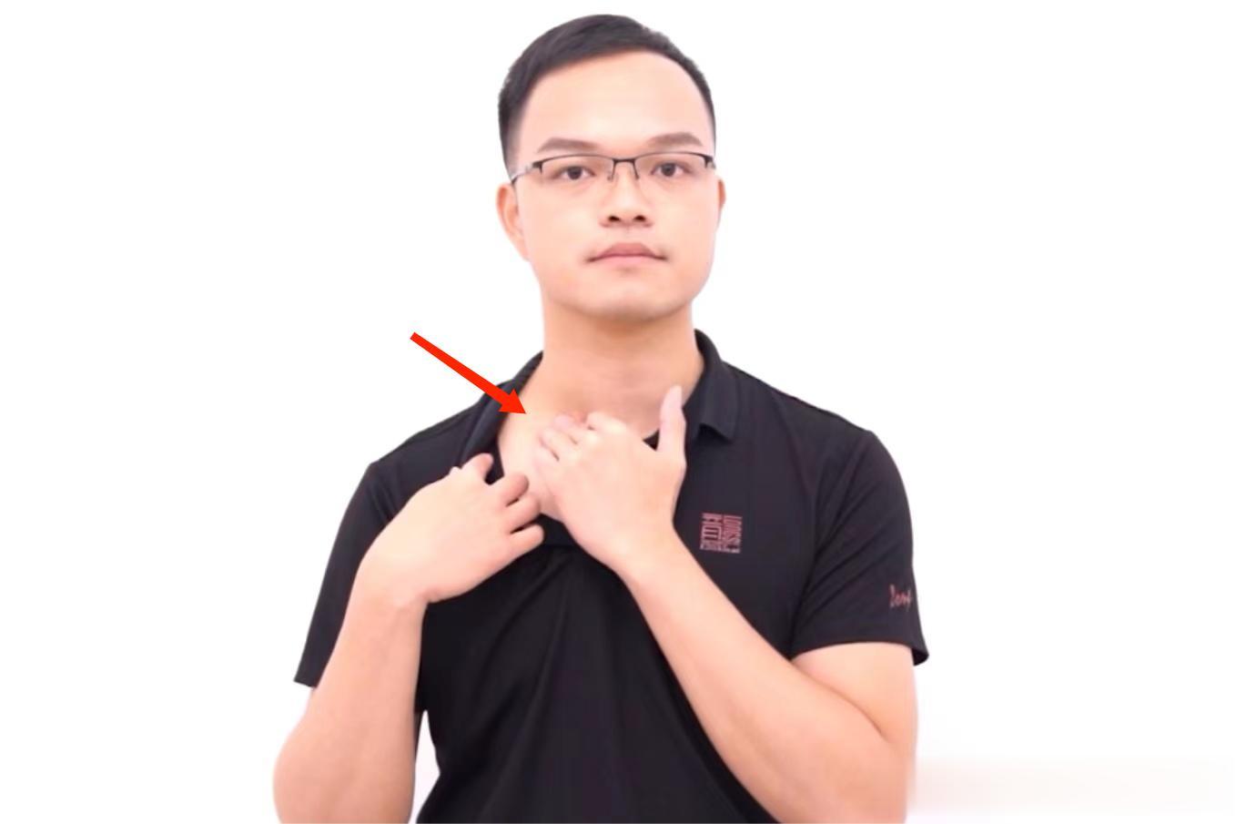 针对斜角肌、胸锁乳突肌等进行放松,将食指与中指放在锁骨上方凹陷处,横向轻轻拨动15–30秒。