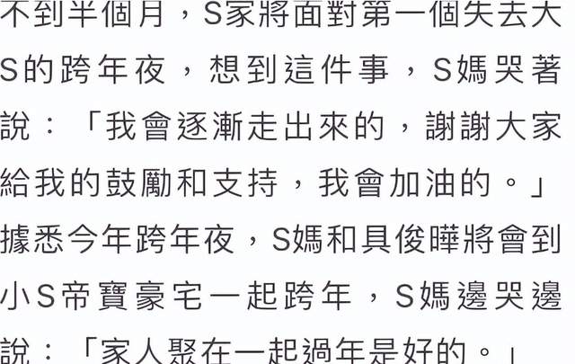 这次S妈回应媒体,表示自己之前都没有办法走路,还是小S带着自己去调理的。现在多少是好了许多,还透露会和具俊晔一起到小S家去跨年!