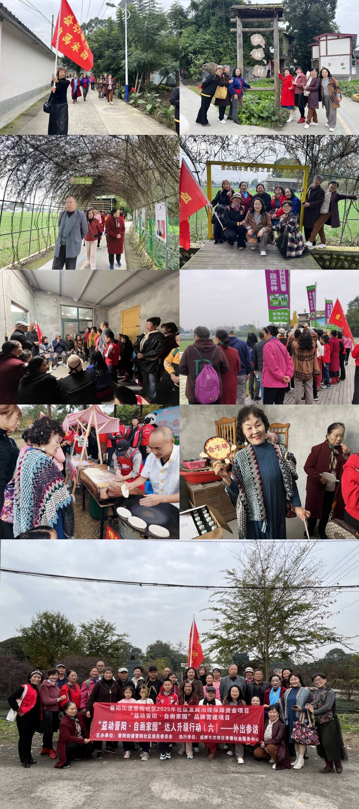 为开阔社区自组织队伍视野,学习社区品牌营建的先进经验,2025年11月13日,由晋阳社区2025年社区发展治理保障资金支持、晋阳社区居民委员会主办、成都市武侯区孝善社会服务中心执行的“益动晋阳·自画家园”品牌营建项目开展了“益动晋阳·自画家园”达人升级行动(六)外出参访活动,组织“益动晋阳·自画家园”文艺宣传队伍成员及居民代表共34人,赴温江万春镇和林村通过实地走访、亲身体验和交流研讨,深入探索了社区文化资源向文化资产转化的成功路径。