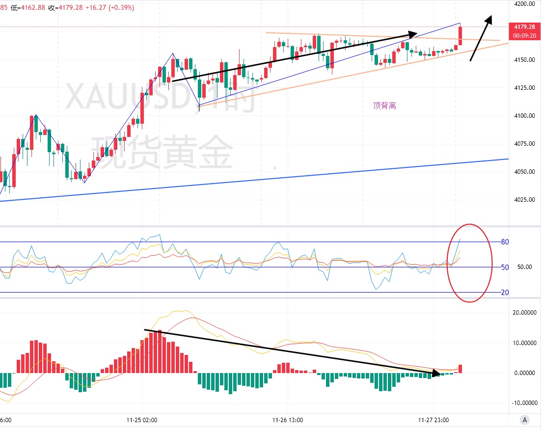 昨天因为感恩节假期,美股、美债都休市,市场整体交投清淡。现货黄金横盘震荡,最终收跌0.14%,报4157.99美元/盎司,不过还是维持在近两周的高点附近;现货白银则连续第四天上涨,收涨0.1%,报53.4美元/盎司。