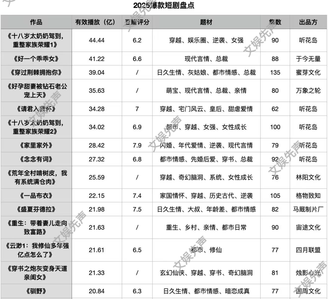 一个更直接的对比是,年度爆款《十八岁太奶奶驾到,重整家族荣耀1》以90集篇幅收获44.44亿播放,单集平均播放量逼近5000万,达到长剧爆款级别。这意味着,一部顶级短剧的流量,已足以与主流视频平台的S级项目一较高下。