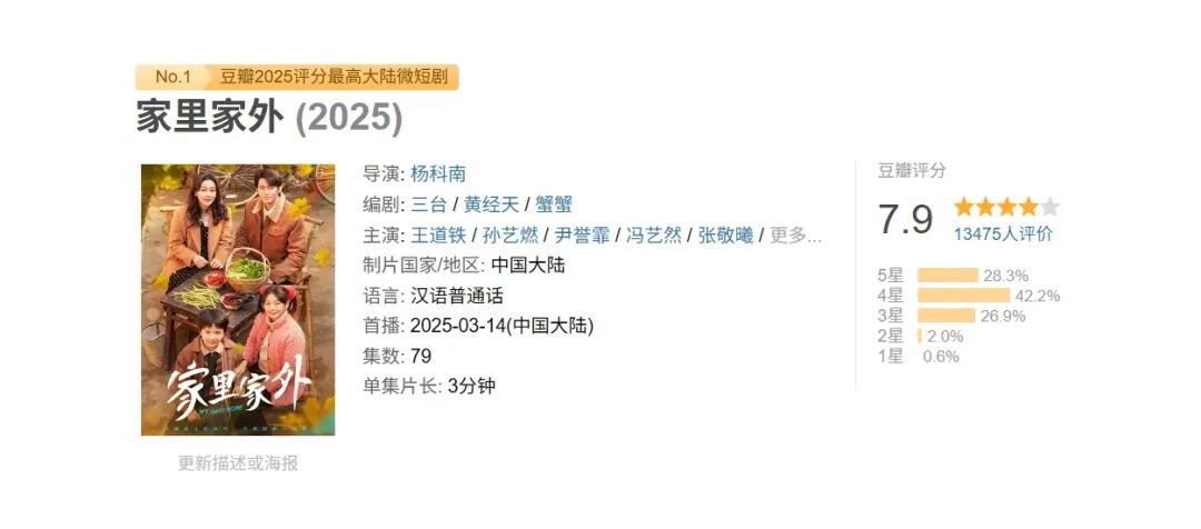 事实上,在今年播放量Top15的短剧中,除了5部未开分,其余作品的豆瓣评分均超过6分。其中,《家里家外》高达7.9分,而《盛夏芬德拉》和《一品布衣》则分别收获7.5分和7.4分。