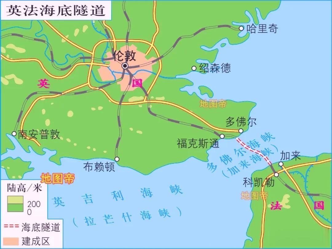 1994年,英法海底隧道开通,西起英国英国肯特郡福克斯通,经东至法国加来海峡省科凯勒,隧道长50.46 千米,其中海底37.9千米,为世界上海底部分最长的隧道。英法海底隧道穿过多佛尔海峡,最低点位于海床以下 75 米,海拔-115 米,是大不列颠岛与欧洲大陆之间唯一的固定通道。