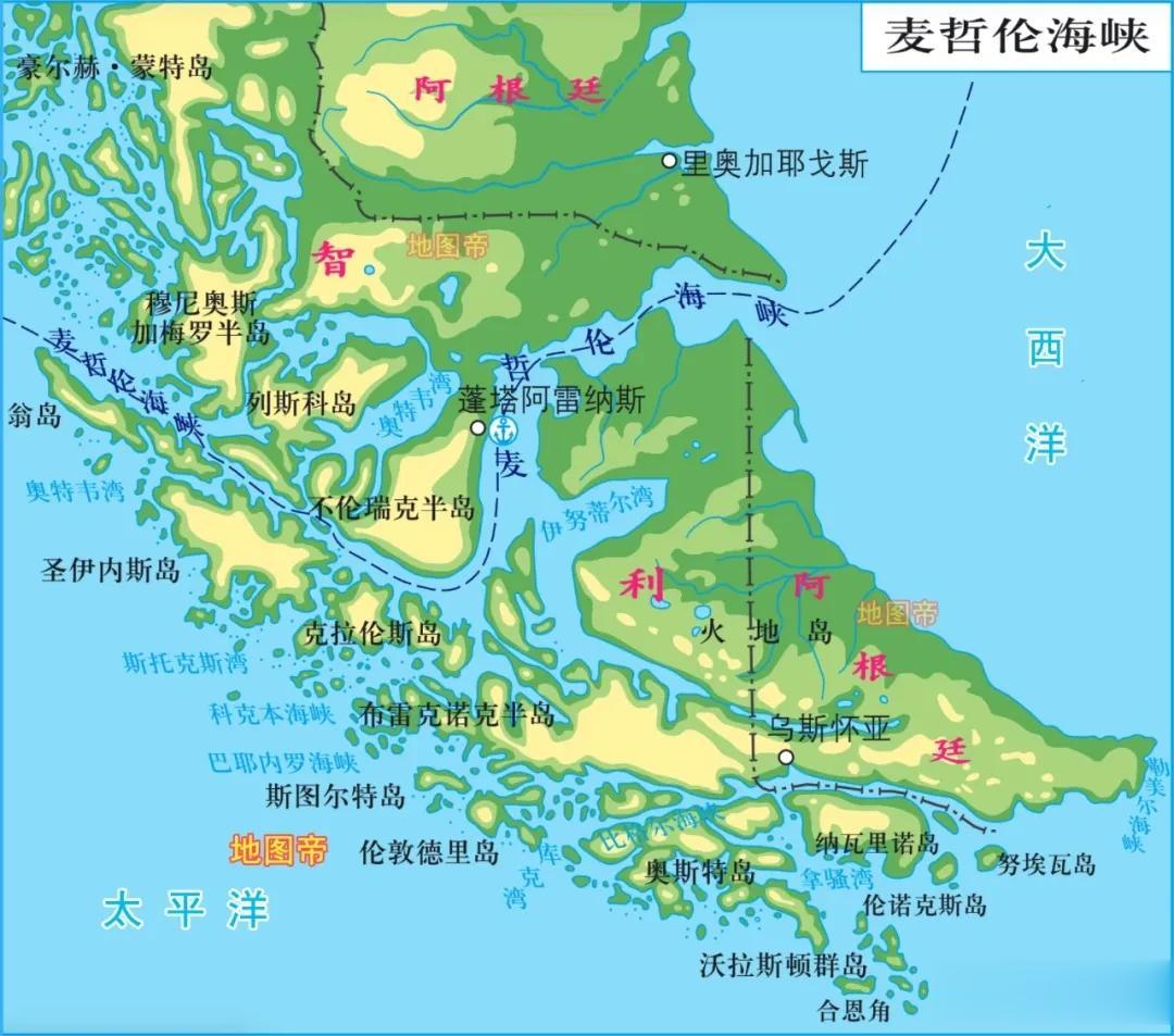 火地岛群岛总面积7.37万平方千米,西部约2/3属智利,东部1/3属阿根廷。