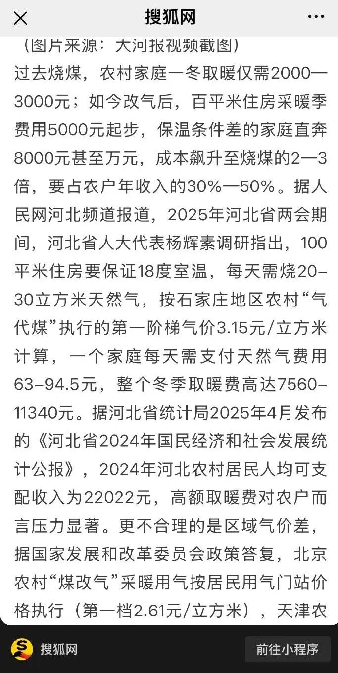 今冬采暖季,河北农村取暖费用高的老问题再度发酵。过去烧煤,农村家庭一冬取暖仅需2000—3000元;如今改气后,百平米住房采暖季费用5000元起步,保温条件差的家庭直奔8000元甚至万元,成本飙升至烧煤的2—3倍,要占农户年收入的30%—50%。2024年河北农村居民人均可支配收入为22022元,高额取暖费对农户而言压力显著。