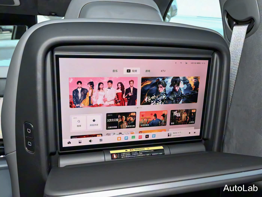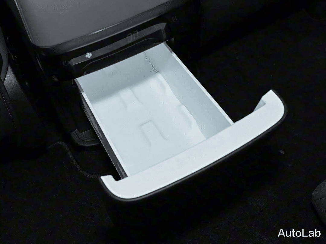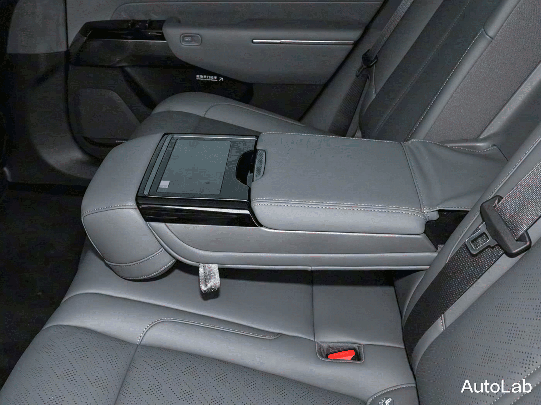 冰箱则调整到了扶手箱底下,更方便后排乘客拿取;这个隐藏式的后排屏也很有特点。