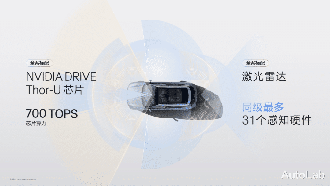 这次极氪7X直接全系标配了千里浩瀚H7辅助驾驶方案,25款上的2颗英伟达Orin-X变成了1颗Thor-U,算力也从508TOPS提升到了700TOPS,激光雷达也依旧是全系标配。