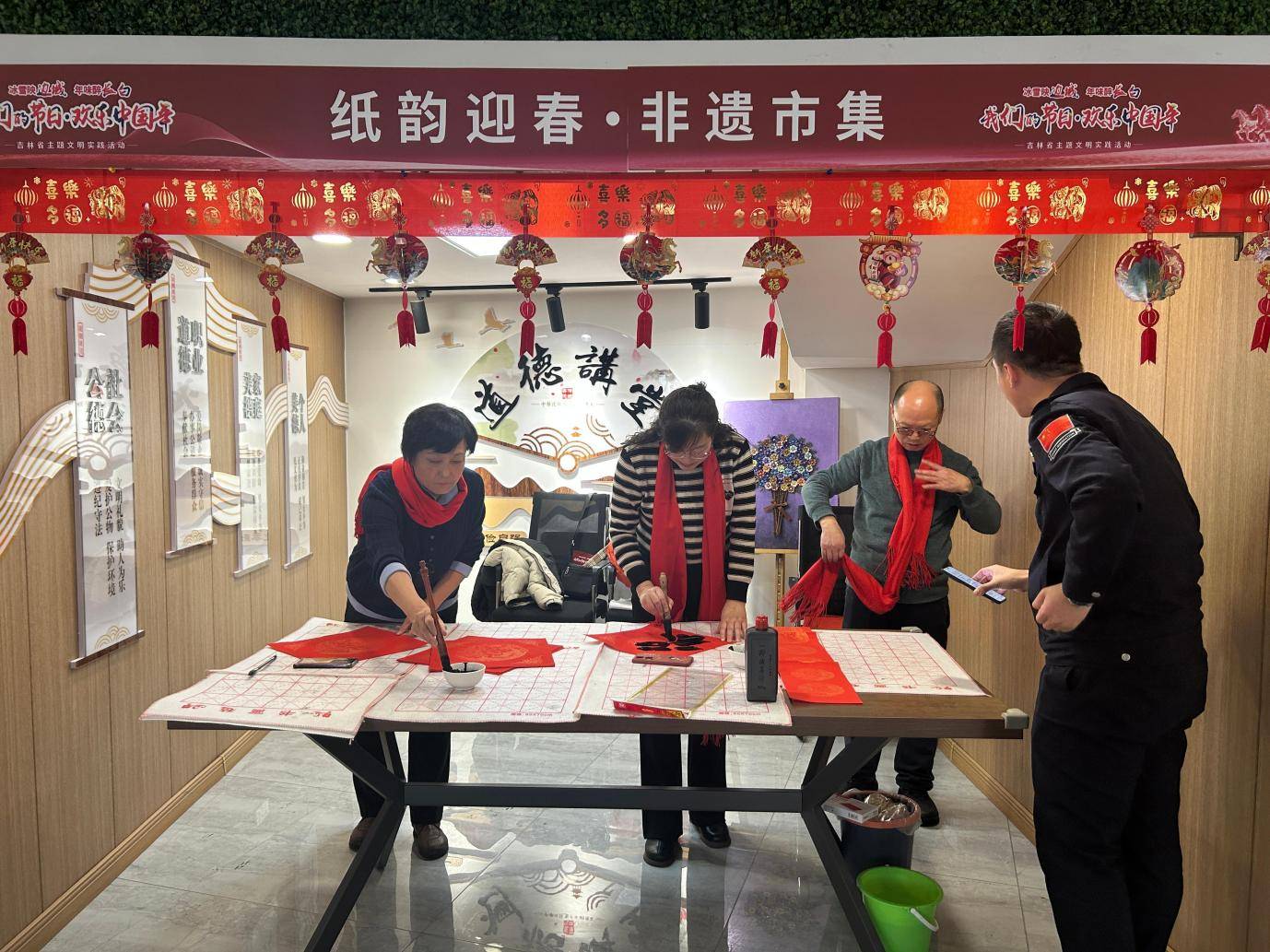 紧邻的“笔墨迎春区”同样热闹非凡。长白县文联书法家们挥毫泼墨,将长白山、鸭绿江等地域符号,与“绿水青山就是金山银山”“文明新风润边城”等时代理念巧妙融合。“雪漫长白辞旧岁,福临边城迎新春”“鸭绿江畔风送暖,长白山中雪迎春”,一幅幅笔墨酣畅的春联、一个个饱满圆润的福字,传递着新春祝福,让非遗文化在笔墨书香中焕发新生,真正实现“让非遗走进当代生活”的活动初衷。