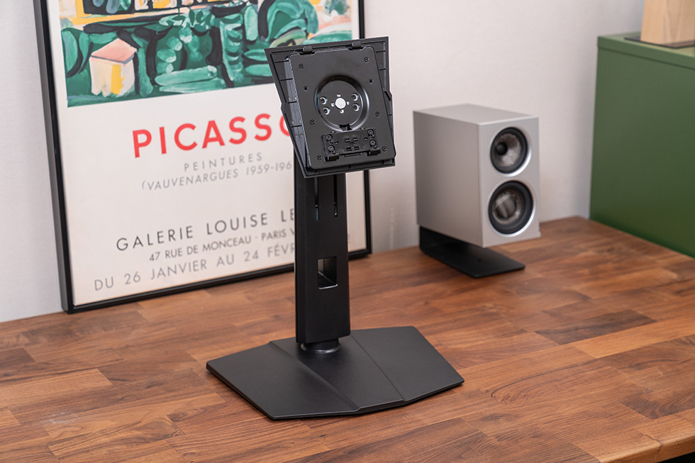 配备一体化平坦底座,支架延续人体工学设计,支持高度升降、前后倾斜与左右旋转调节,可轻松适配不同桌面高度与使用姿势。支架与底座的连接结构稳固,调节过程顺滑无卡顿,即使在激烈操作时也能保持显示器稳定,兼顾实用性与安全性。