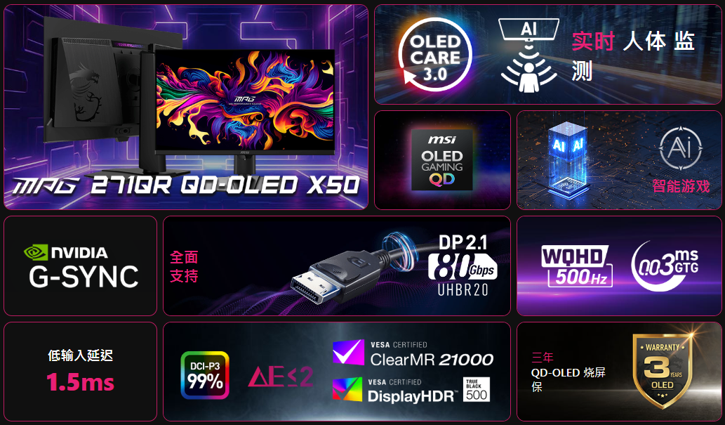 在电竞竞技愈发追求 “毫秒级优势” 的当下,玩家对显示器的要求早已突破 “能看” 的基础层面 —— 既要 500Hz 级别的超高刷新率带来丝滑画面,又渴望 QD-OLED 技术呈现的细腻色彩,更需解决 OLED 面板长期使用中的烙印隐忧。这三大需求如同 “三角难题”,此前鲜有产品能做到完美平衡。 而微星作为深耕电竞硬件领域的头部品牌,此次推出的 MPG 271QR QD-OLED X50,恰恰以 “破局者” 的姿态登场:它不仅搭载第四代 QD-OLED 面板,将 2K 分辨率下的刷新率拉满至 500Hz,更创新性融入 AI 人体侦测技术,从而满足玩家对流畅度、色彩与耐用性的极致追求。