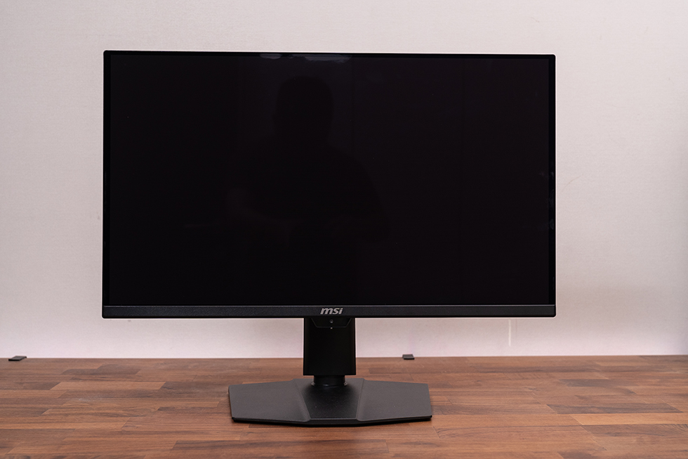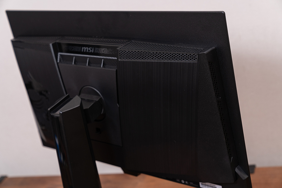 采用微星经典的摇杆式操控方案,正面底部居中位置设置五向摇杆,左侧为电源键,右侧为 G 键(游戏快捷功能键),布局逻辑清晰。这种设计无需摸索即可完成菜单导航、参数调节与功能切换,熟悉微星显示器的用户可快速上手。