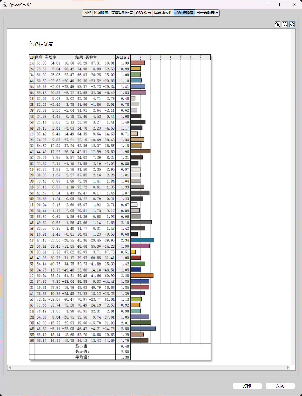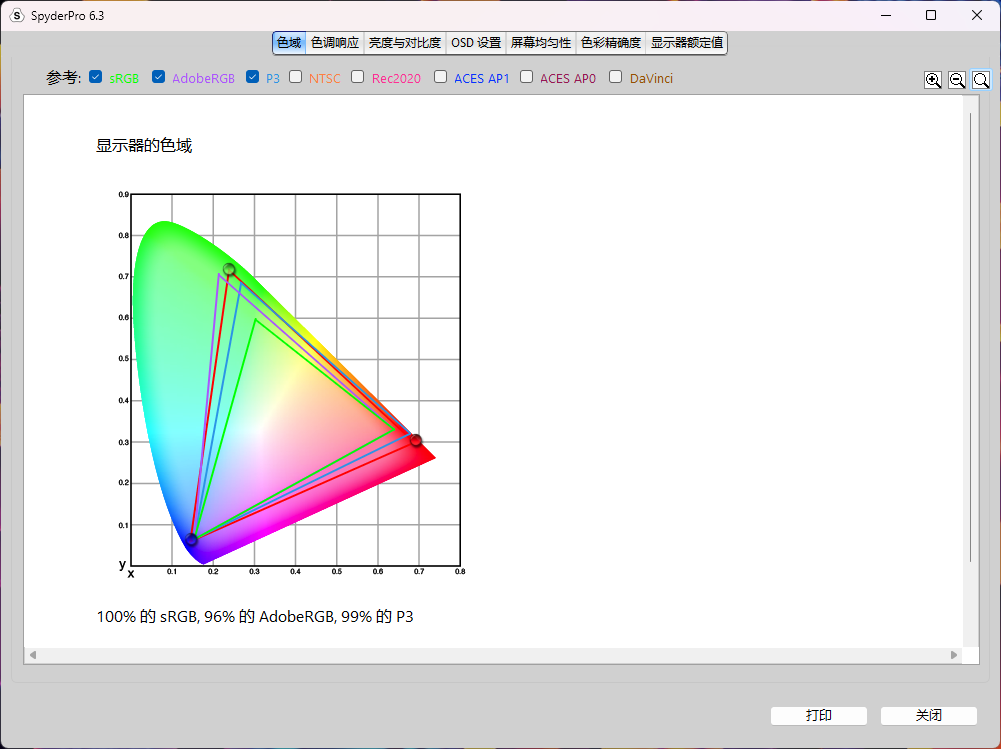 使用红蜘蛛进行屏幕素质测试,依托 QD-OLED 技术优势,屏幕实现 DCI-P3 99%、Adobe RGB 96%、100% sRGB 的广色域覆盖,搭配 10bit 色深,可呈现 10.7 亿种色彩,色彩过渡自然细腻。出厂前经过专业校色,ΔE<2 的色彩准确度能精准还原游戏场景的真实色调。
