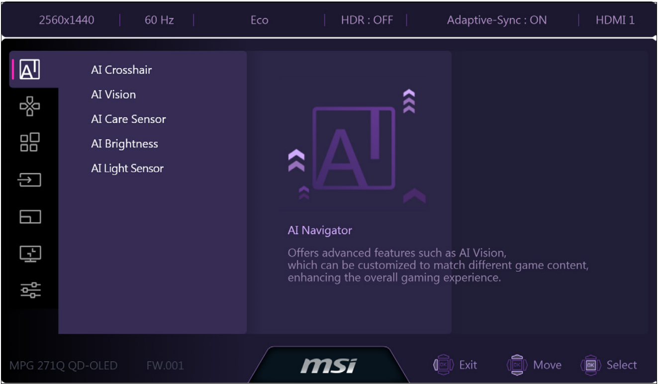 显示器搭载 AI Navigator 功能,可自动识别使用场景并优化 MSI AI 相关设置,无需手动调节即可匹配最佳显示参数。无论是竞技游戏、影音播放还是办公创作,都能快速切换至对应模式,兼顾专业性与操作便利性。