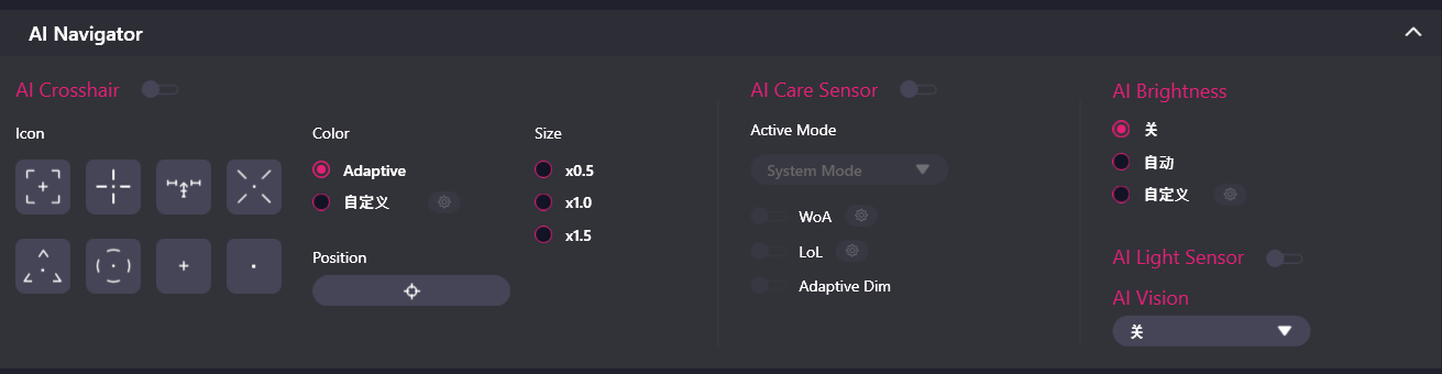 OSD菜单方面采用了电竞系列的菜单设计,可以使用五维遥杆进行快速切换。此外,显示器通过安装Gaming Intelligence软件还支持PC端设置,如开启AI功能、KVM、自动更新以及游戏倍镜功能等,为玩家带来更加便利的操作体验。无论是调整显示器设置还是进行游戏设置,都能轻松实现。