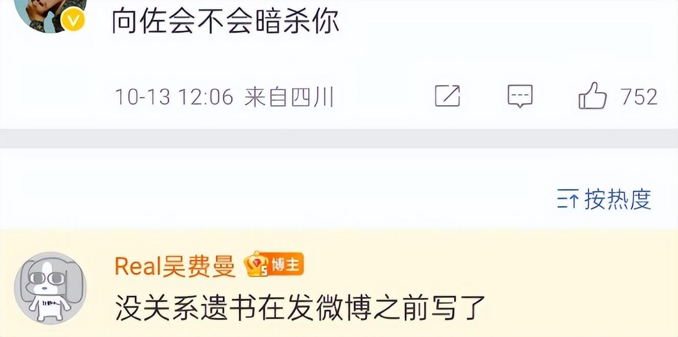 在这部电影中,向佐饰演的“沈岸”有一个经典动作,那就是举着手指紧贴鼻梁,当这样的动作连续出现后,网友们在线进行模仿,而费曼直接发文:《遇见》,看电影不要向左,向右,要向前看,然后配上自己和父亲吴镇宇的照片,最关键的是,向佐还回复费曼:兄弟连你都不放过我?而费曼直接回复网友:没关系遗书在发微博前写好了。