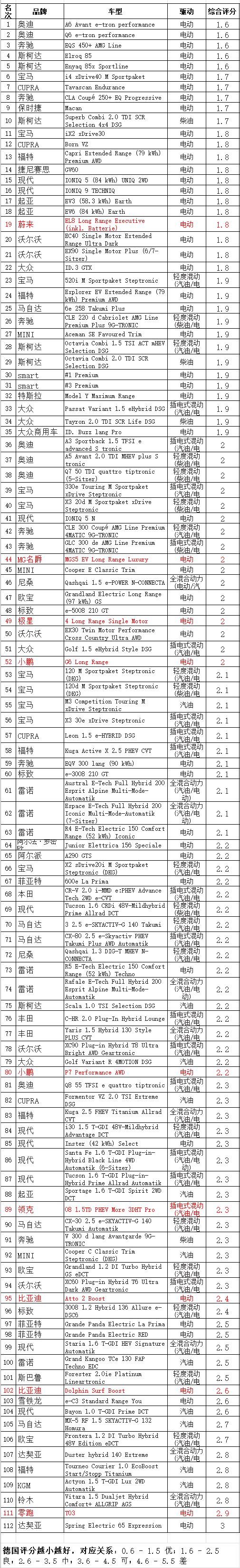 评分以德国学校成绩表示,根据 ADAC 汽车测试的总成绩进行排序,如果成绩相同,则按品牌、车型字母顺序排序。