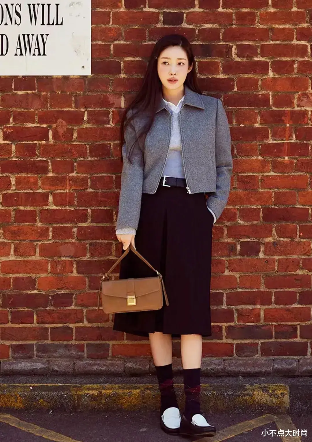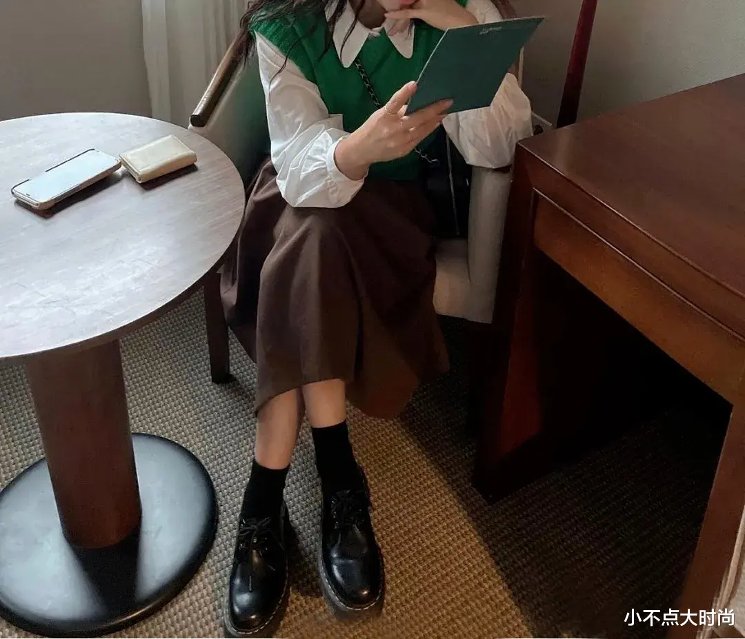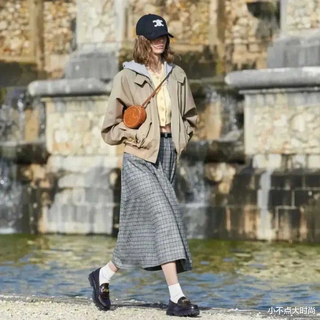 浅棕色的格纹半身长裙,搭配黑色乐福鞋和黑色袜子,繁简结合,复古气质,尽显文艺气息,时尚十足。▼