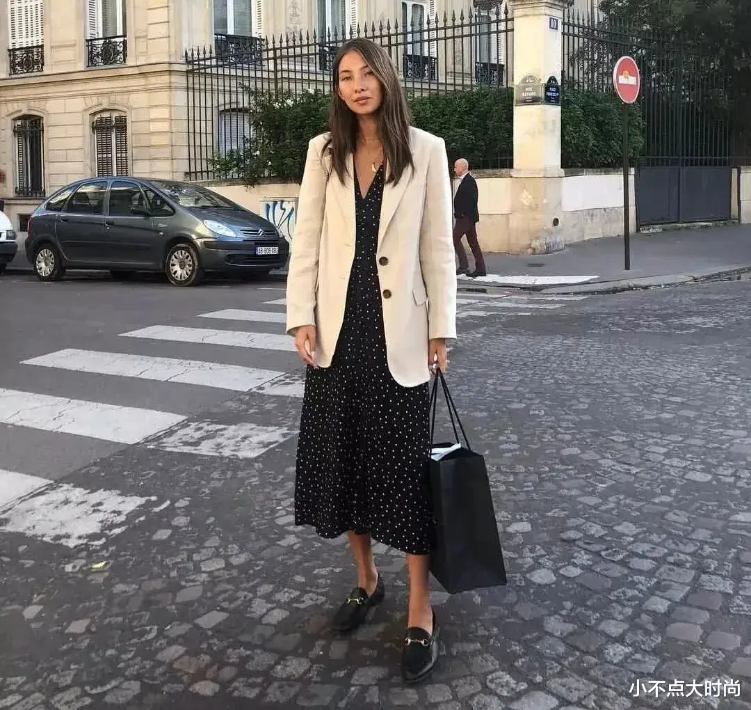 比如一条波点的黑色的连衣裙神秘而优雅,波点元素足够吸睛,就搭配简约基础款的黑色乐福鞋,一繁一简,穿搭更加气质耐看。▼