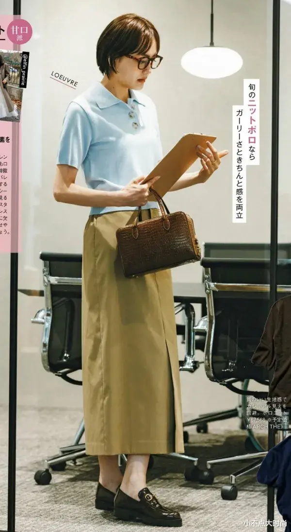 卡其色的高腰直筒长裙,利落经典、简约气质,搭配一双黑色的漆面乐福鞋,也是简约大方的款式,让整套穿搭干净气质,干练中又有女性优雅的魅力,独立而高级。▼