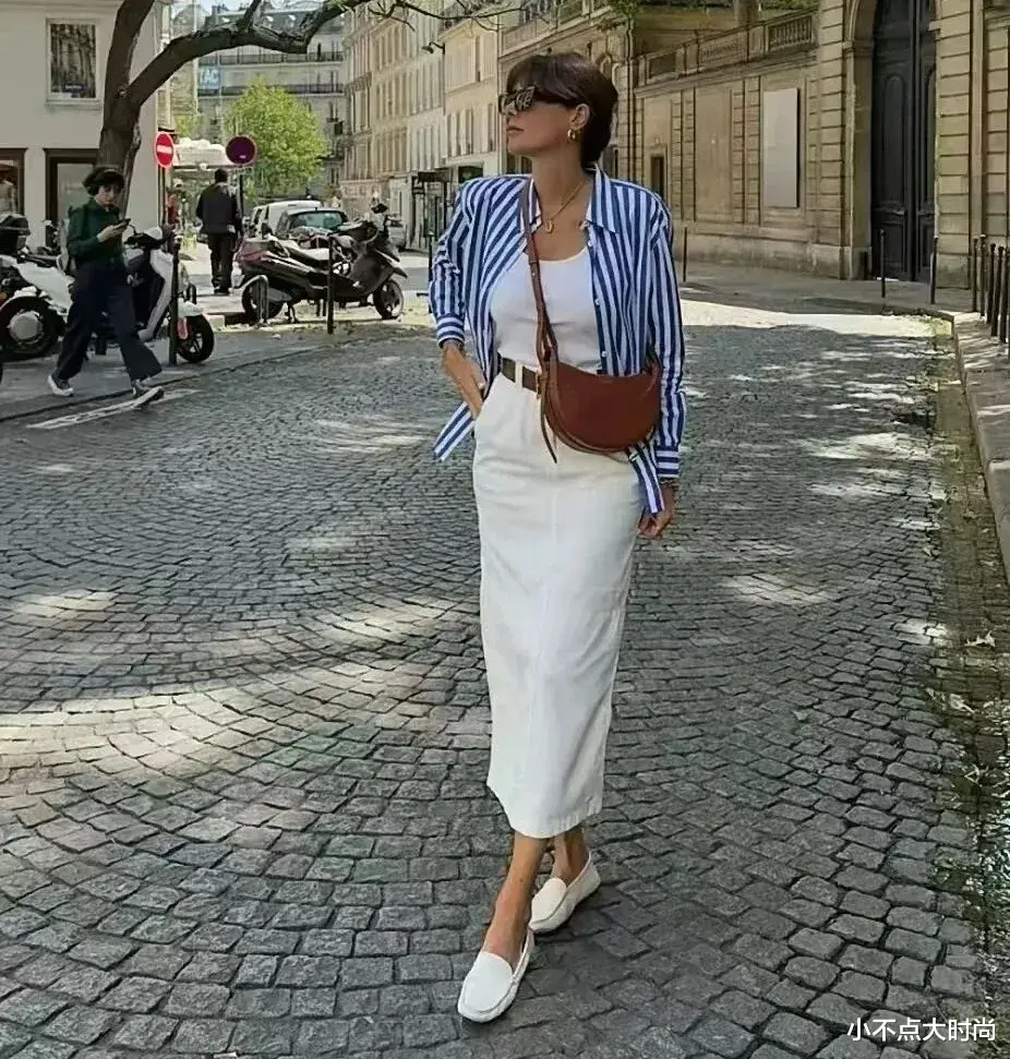 白色的直筒半身裙搭配白色背心,脚上穿白色的乐福鞋,一整个同色系搭配,视觉显高,干净气质又有高级感。外搭一件蓝白条纹衬衫外套,清爽气质,利落大方。▼