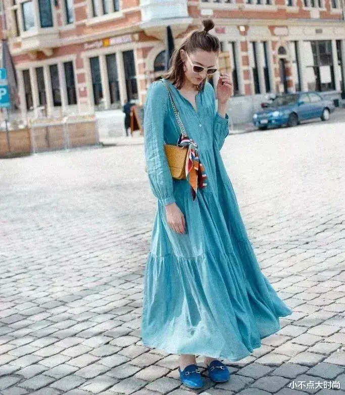 蓝色的连衣裙搭配同色系的乐福鞋,视觉协调很显高。整套蓝色系搭配清新淡雅,时尚有品位。▼