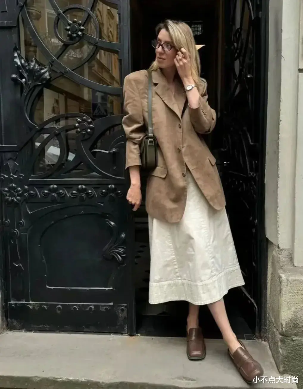 浅棕色的连衣裙复古优雅,搭配浅棕色的乐福鞋,视觉延伸感很显高。乐福鞋的复古和质感为裙子增添氛围感,让搭配气质又有高级感。▼