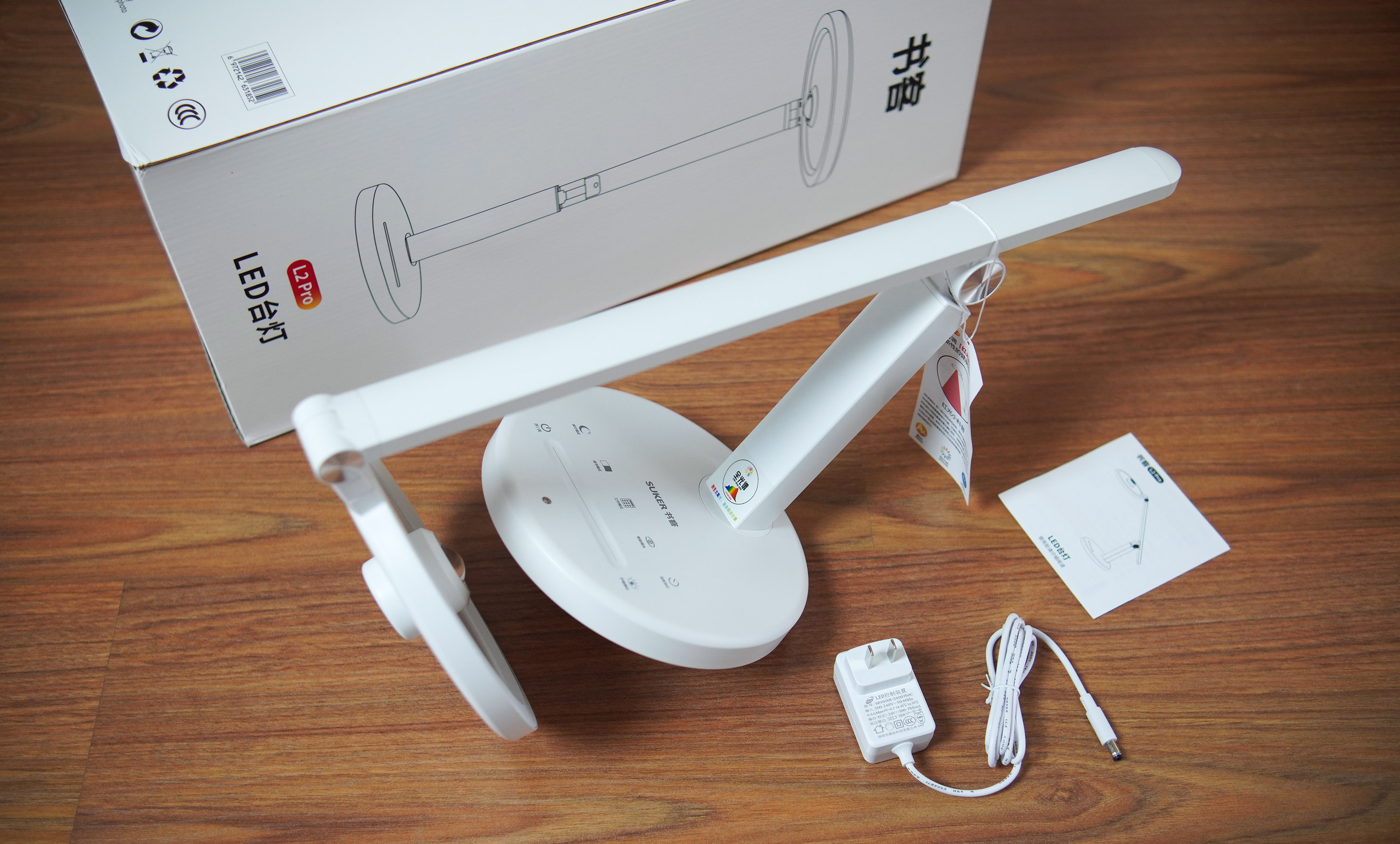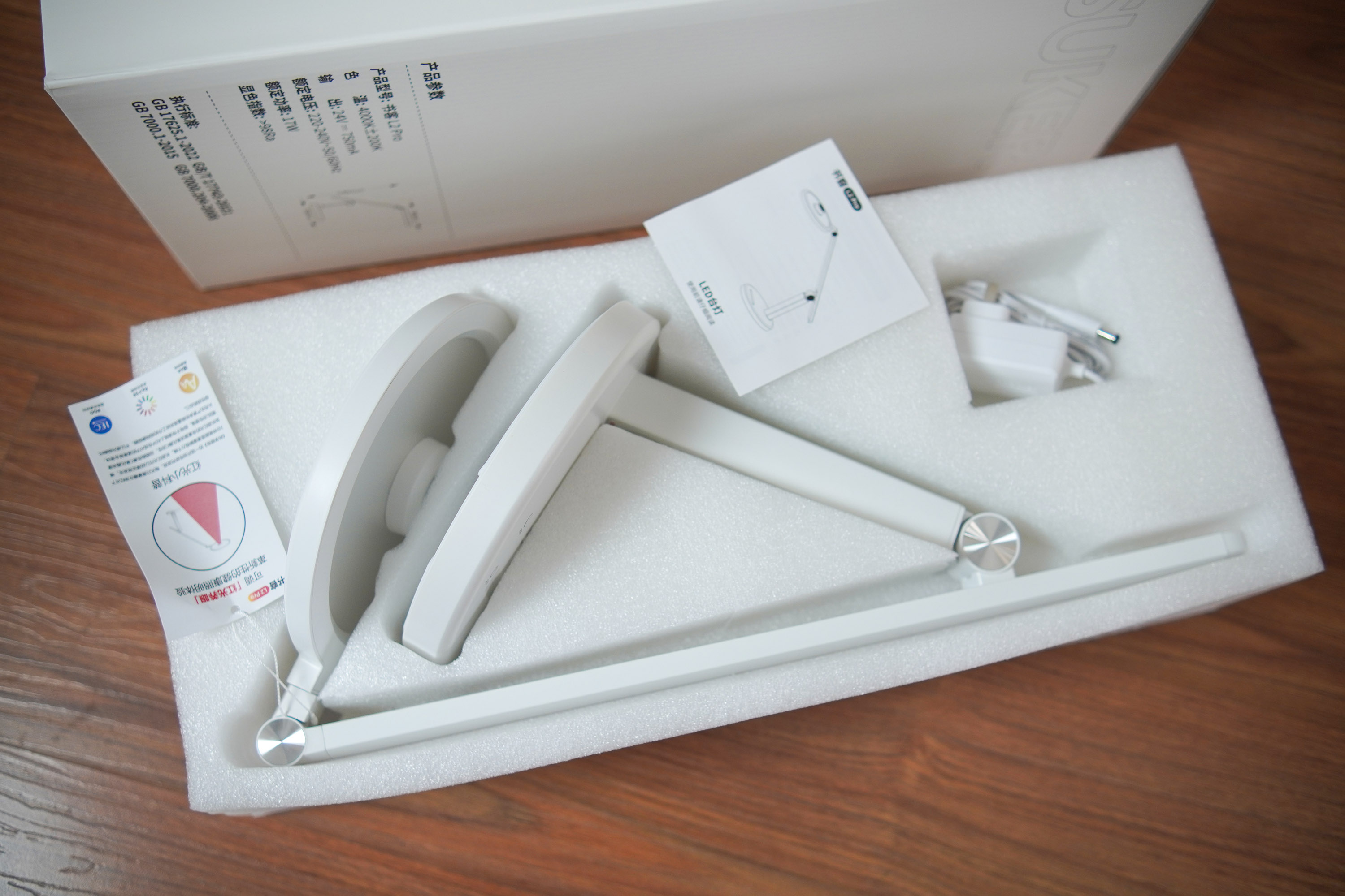 将折叠着的台灯主体从包装盒中取出,台灯采用了稳固的圆形底座设计,确保在使用过程中不会晃动。灯臂与灯头是一体化的设计,伸展开灯臂即可使用,整个过程简单快捷,无需任何工具再进行组装。