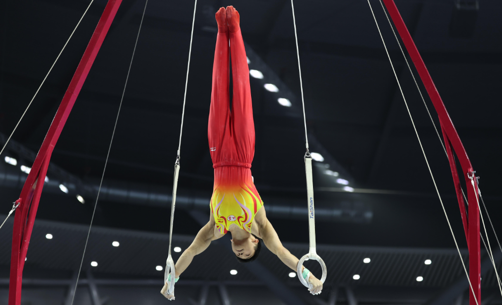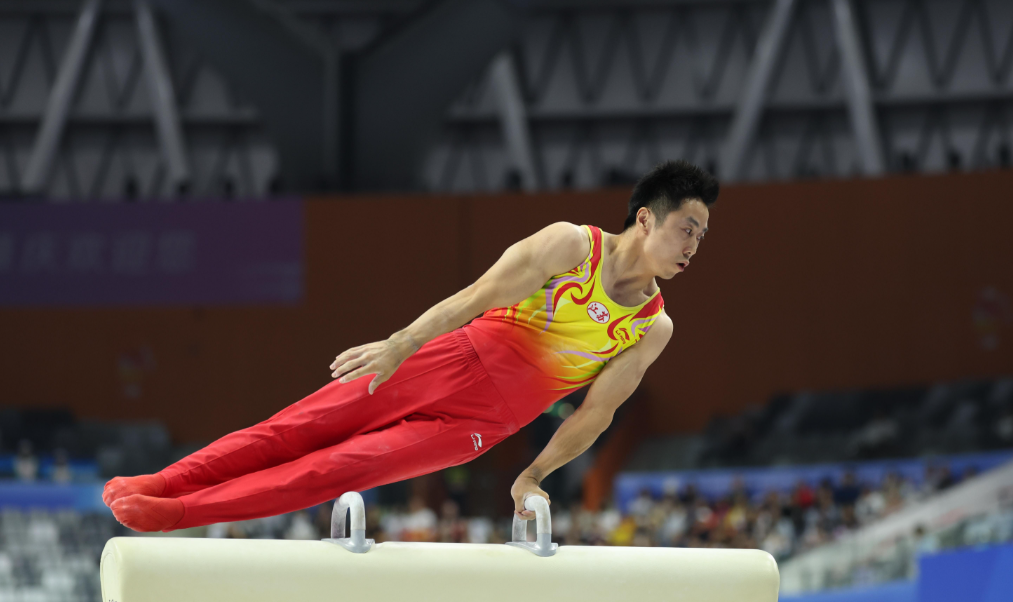 本届全运会,江苏体操男团的卫冕之路并非一帆风顺。预赛中,张博恒领衔的湖南队排名第一,晋级决赛,江苏队位列第二。决赛中,江苏队与湖南队首先在自由体操项目上展开争夺,比分相同。第二轮鞍马项目,新科世锦赛鞍马冠军、江苏队洪延明以14.466分帮助江苏队取得领先优势。第三轮吊环,东京奥运会吊环亚军尤浩斩获14.400分。此轮战罢,江苏队已领先湖南队2.634分。湖南队奋起直追,但江苏队稳定发挥,最后一项单杠主动降低难度。最终,江苏队以总分328.957分获得金牌。