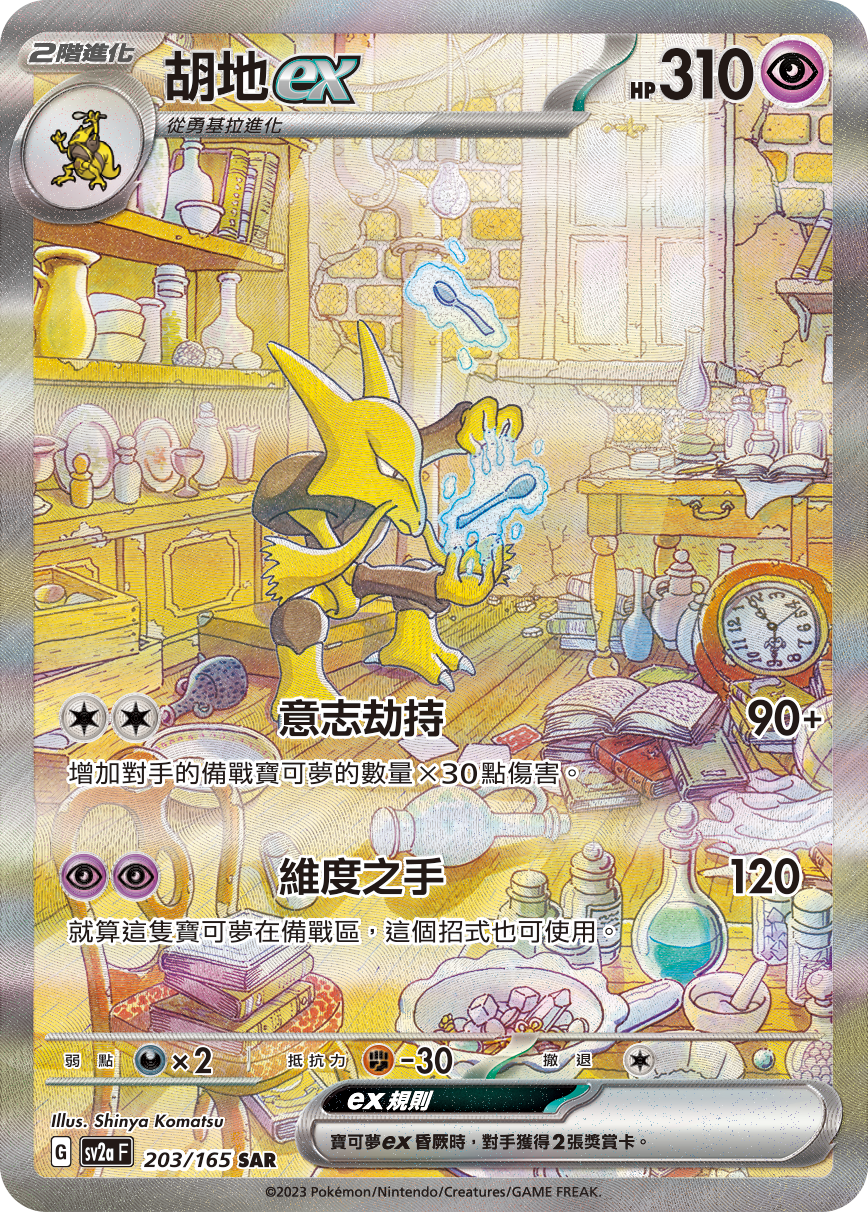 胡地,念力宝可梦,属性(超能力),身高(1.5米),体重(48.0千克),特性(同步:将自己的中毒、麻痹或灼伤状态传染给对手。精神力:拥有经过锻炼的精神,而不会因对手的攻击而畏缩。对威吓也毫不动摇。),隐藏特性(魔法防守:不会受到攻击以外的伤害。),弱点(虫、幽灵、恶),所属世代(第一世代),图鉴编号(065号)。