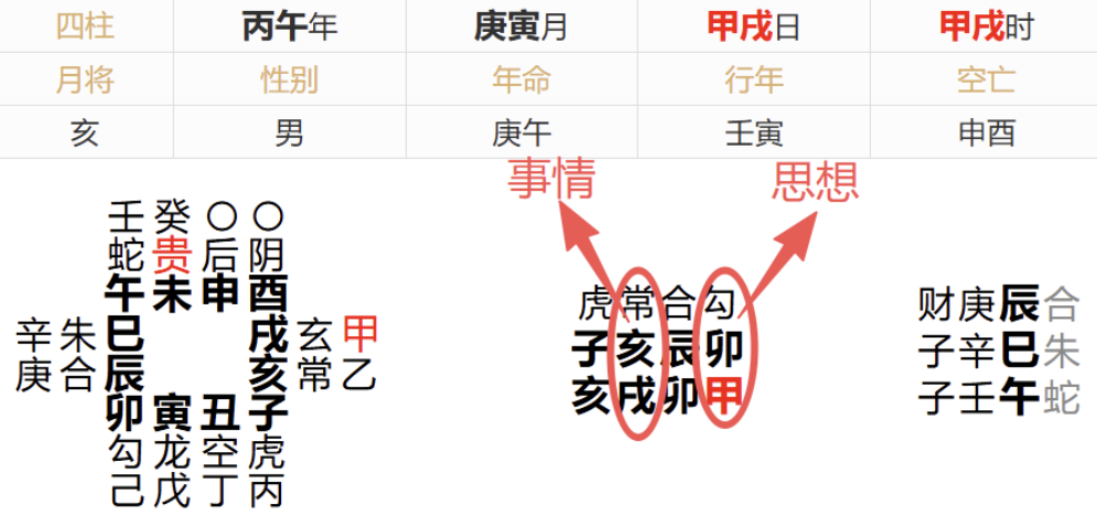 他其实不太想去,因为他的思想为卯,卯是日干甲木的羊刃,羊刃有一种固执、偏执、不愿意随波逐流的态度,上临勾陈,勾陈就是牵连,可能是他觉得人太多了,不喜欢。但是亥水生卯木生甲木,事情生思想,卯木又合戌土,就是必然会去,即便不太想去。