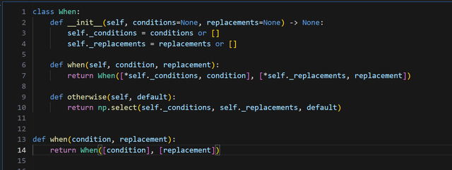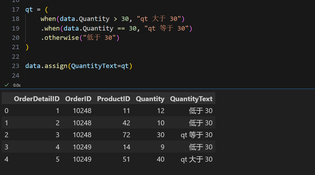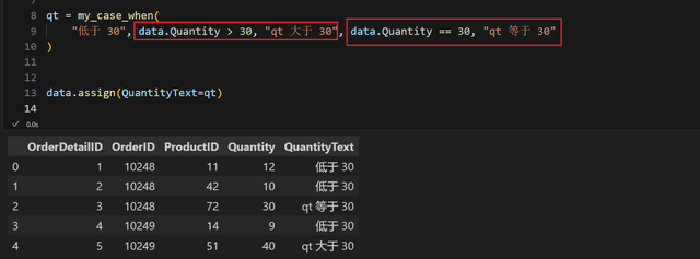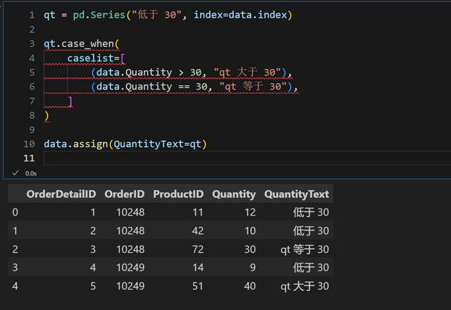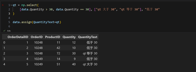 不明原因,没有智能提示很类似前面的 np.select ,只不过把结构弄成一个元组列表,每个元组对应 (条件,值)。而默认值就要在一开始定义到列里面。