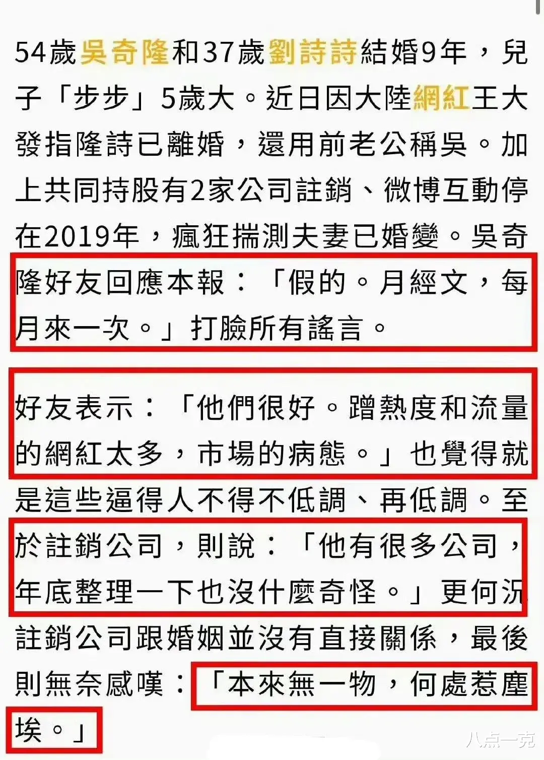面对网络上的猜测和质疑,吴奇隆好友也出面发辟谣,“假的,月经文,每月来一次。两个人很好,蹭热度和流量的网红太多了,市场的病态。况且他们名下有很多公司,趁着年底清理一下也没什么奇怪的。”