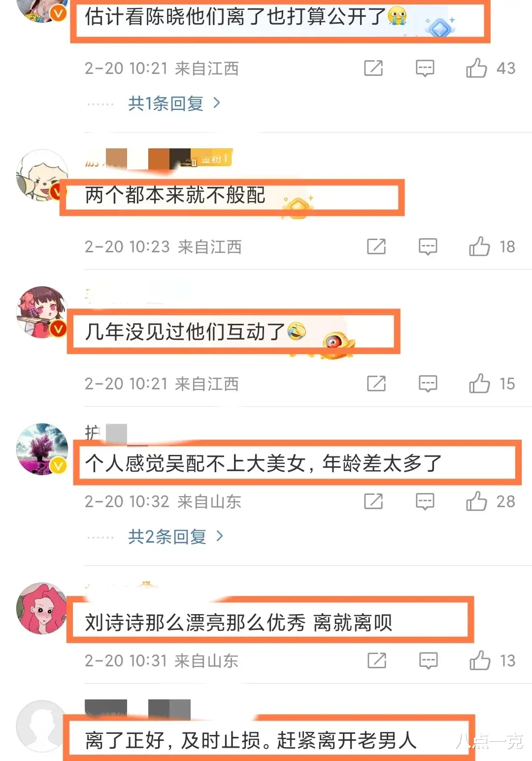 对于两人的婚变传闻,很多网友纷纷留言表示,估计他俩看见陈晓陈妍希官宣离婚后也打算公开了,两个人本来就不相配,而且刘诗诗那么漂亮,那么优秀,离了正好,及时止损,赶紧离开老男人。